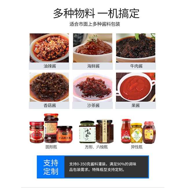 牛肉醬灌裝機采用活塞式氣缸氣動原理,適用于調味品中帶顆粒并且濃度較大的香菇醬、辣椒醬、豆瓣醬、花生醬、芝麻醬、果醬、牛油火鍋底料、紅油火鍋底料等較為粘稠醬類的灌裝。灌裝轉閥可以很具客戶物料定做加大,以適應不同客戶物料的灌裝需求。